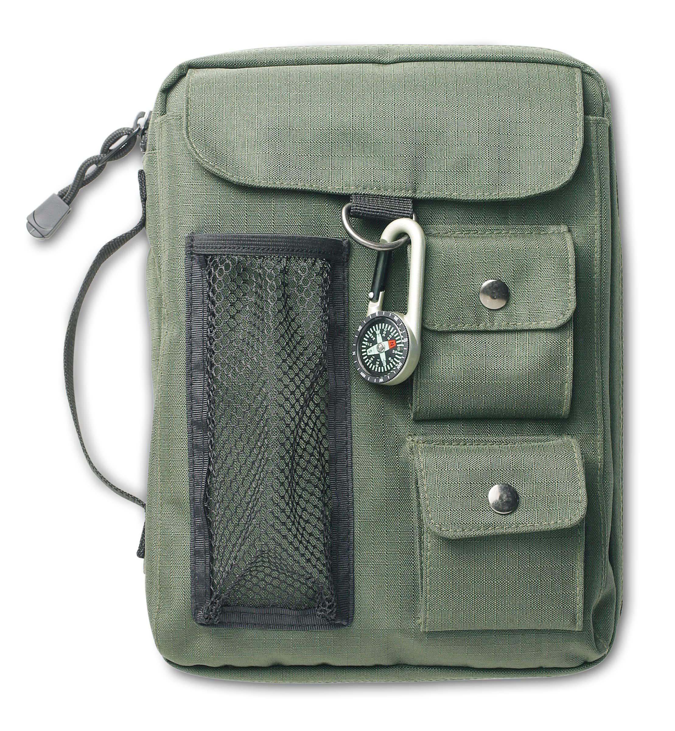 Feita em nylon durável, esta capa esportiva para Bíblia possui vários bolsos externos, um mosquetão de bússola legal, puxadores de zíper duráveis, alça de lombada e porta-lápis e caneta interna. Esta capa caberá bíblias e livros com medidas até 22,4 cm x 15,6 cm.